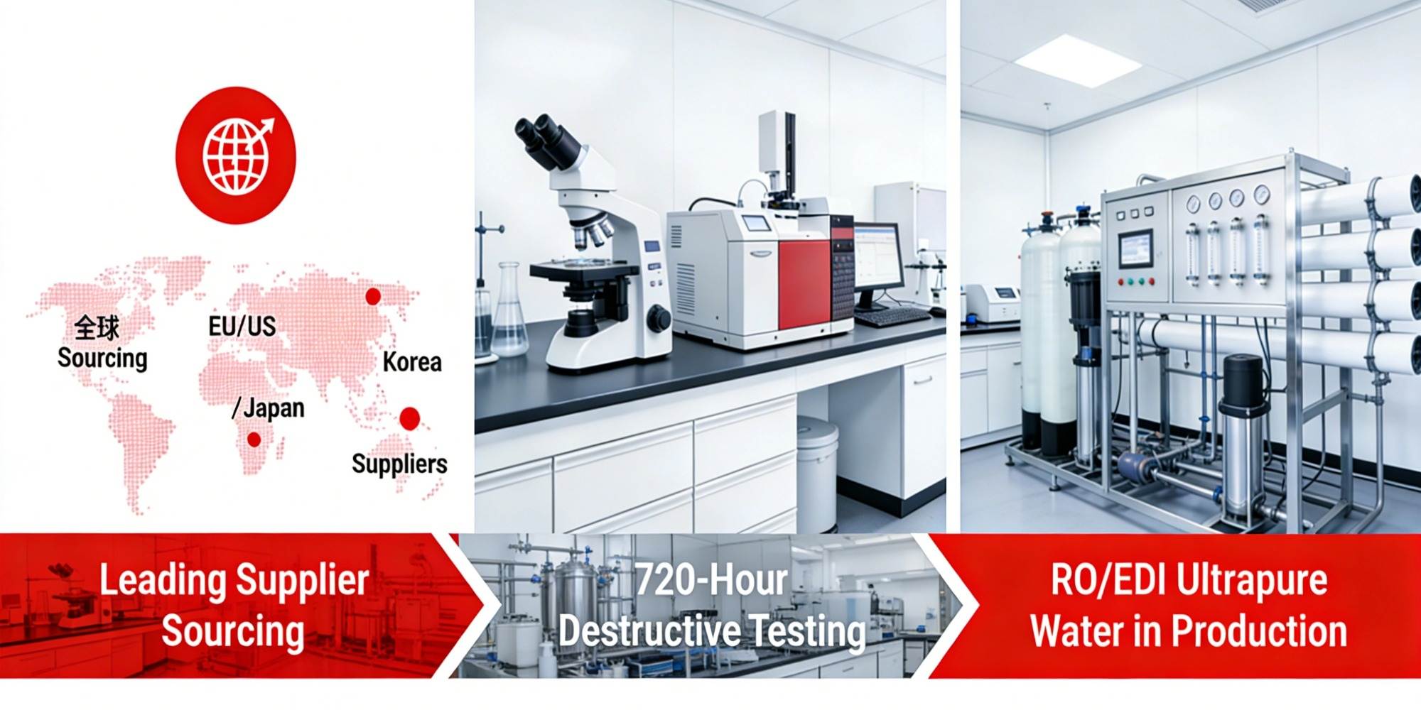 ด้วยการจัดหาวัตถุดิบจากซัพพลายเออร์ชั้นนำทั่วโลกจากสหภาพยุโรป สหรัฐอเมริกา ญี่ปุ่น และเกาหลี ห้องปฏิบัติการภายในบริษัทที่ทำการทดสอบแบบทำลายล้างนาน 720 ชั่วโมง และการใช้น้ำบริสุทธิ์พิเศษ RO/EDI ตลอดกระบวนการผลิต เราจึงมั่นใจได้ในคุณภาพของวัตถุดิบ ความปลอดภัยของผลิตภัณฑ์ และความเสถียรของสูตร