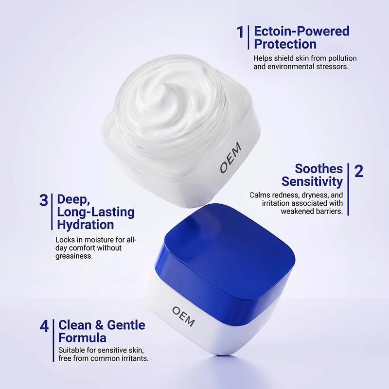 ครีมบำรุงผิวสูตรพิเศษนี้ ผสมผสานเอ็กโทอินบริสุทธิ์สูง ช่วยปกป้องผิวจากมลภาวะภายนอก พร้อมมอบความชุ่มชื้นอย่างล้ำลึกและยาวนาน บรรเทาอาการผิวแห้ง แดง และตึง เหมาะสำหรับผิวบอบบางและผิวในเมือง เนื้อครีมเข้มข้นแต่ไม่เหนียวเหนอะหนะ ซึมซาบเร็ว ผลิตในห้องปลอดเชื้อ GMPC ปรับแต่งได้เต็มที่ ได้รับความไว้วางใจจากแบรนด์ระดับโลก