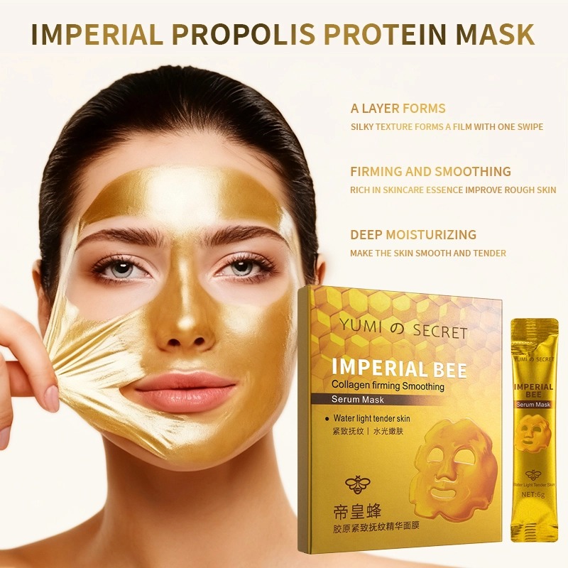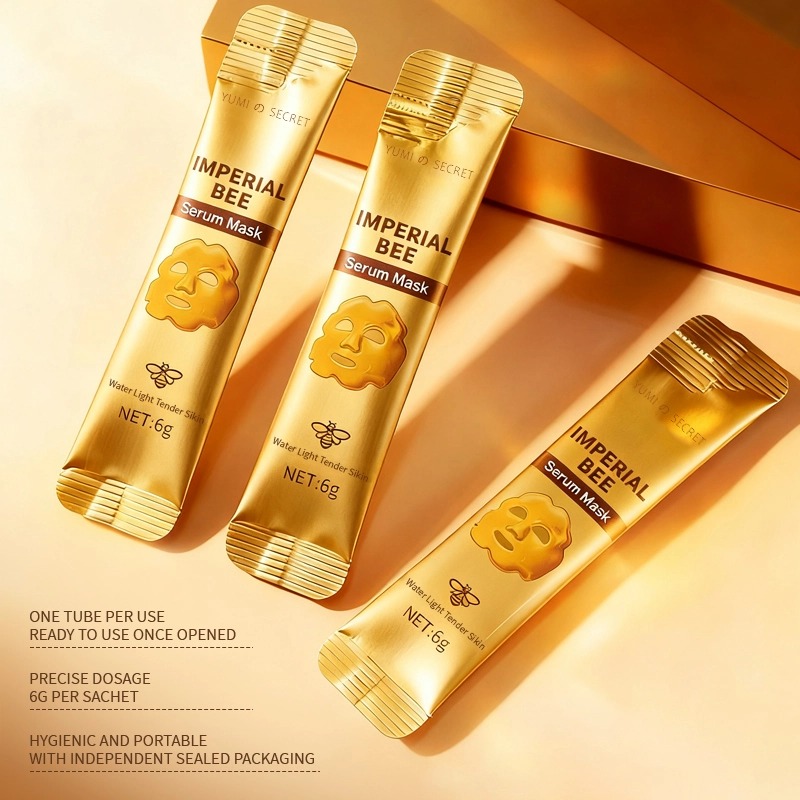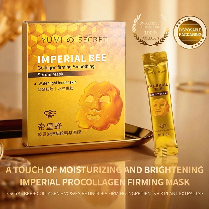 มาส์กเซรั่มกระชับผิวและเรียบเนียน IMPERIAL BEE Collagen Firming & Smoothing Serum Mask – มาส์กแบบลอกออกใช้ครั้งเดียว มีส่วนผสมของคอลลาเจนที่เลียนแบบคอลลาเจนของมนุษย์และสารสกัดจากผึ้งหลวง มาส์กจะสร้างฟิล์มยืดหยุ่นที่ช่วยกักเก็บส่วนผสมสำคัญ พร้อมช่วยปรับสภาพผิวให้กระชับขึ้น ลดเลือนริ้วรอยเล็กๆ และให้ความชุ่มชื้นอย่างล้ำลึก เนื้อบางเบา ไม่เหนียวเหนอะหนะ ลอกออกง่าย – ไม่ต้องล้างออก เหมาะสำหรับผิวผู้ใหญ่ ผิวแห้ง หรือผิวหมองคล้ำ บรรจุในซองขนาด 6 กรัม ถูกสุขอนามัย มีบริการผลิตสินค้าภายใต้แบรนด์ของลูกค้า (Private Label) พร้อมบรรจุภัณฑ์และแบรนด์ที่กำหนดเอง